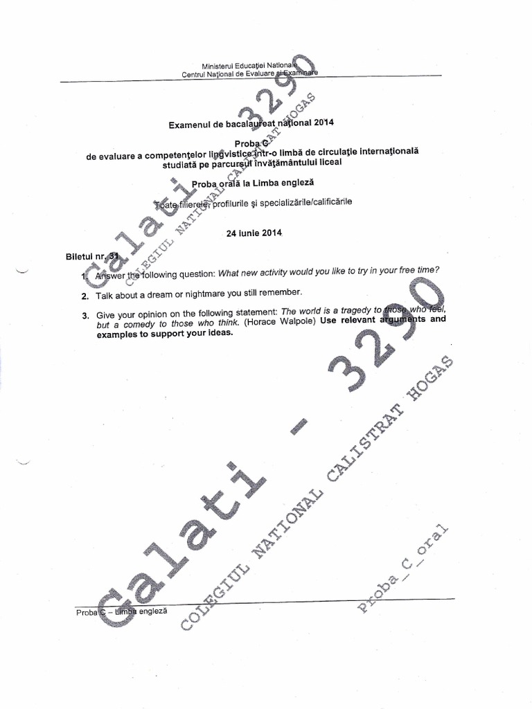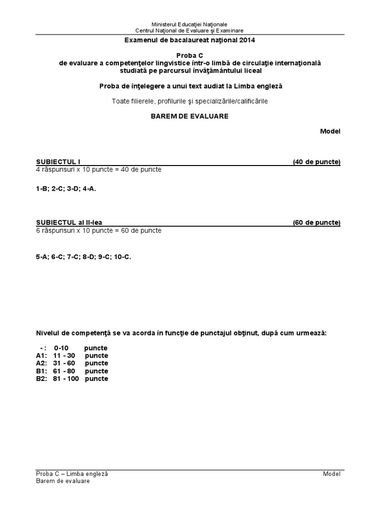 2014 0 comentarii fii primul care comenteaza. Examenul de bacalaureat naţional 2014 proba c de evaluare a competenţelor lingvistice într o limbă de circulaţie internaţională studiată pe parcursul învăţământului liceal proba scrisă la limba engleză toate filierele profilurile şi specializările calificările barem de evaluare model. Engleza oral si scris modele de subiecte si bareme joi 20 iunie 2013 ora 13 05 examenul de bacalaureat de anul acesta care a inceput pe 10 iunie continua cu proba de evaluare a competentelor lingvistice intr o limba de circulatie internationala. Subiecte 2013 engleza.