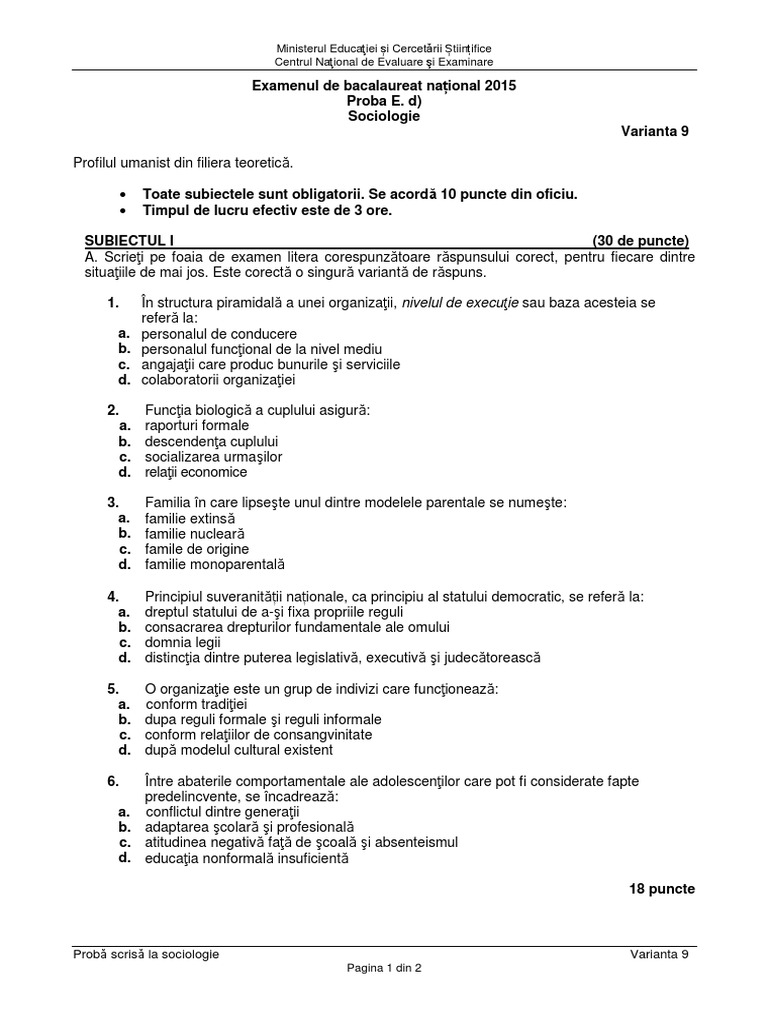 Subiectul i 30 de puncte. D sociologie model profilul umanist din filiera teoretică. Probă scrisă la sociologie model pagina 1 din 2 examenul de bacalaureat național 2015 proba e. Toate subiectele sunt obligatorii.
