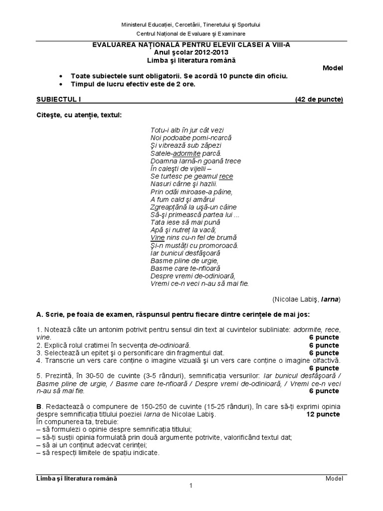 Barem de evaluare si de notare limba si literatura romana vezi notele evaluare nationala 2013. Evaluarea nationala 2013 marti incepe primul examen limba si literatura romana. Ofertele liceelor din bucuresti cele mai bune colegii din capitala si calendarul admiterii in brosura lansata de inspectoratul scolar. Subiecte română evaluare națională 2013 olimpicii de clasa a viii a care au susținut deja proba la limba română la evaluare națională 2013 au primit o compunere în care au avut de caracterizat personajul fata moșneagului dintr un fragment din.