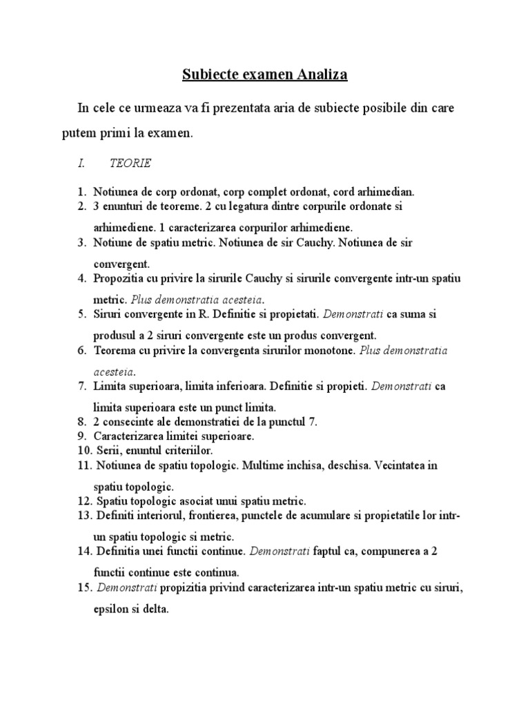 Subiecte Examen Analiza Matematica Anul 1