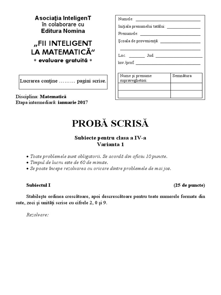 Subiecte fii inteligent la matematica 2017. Subiecte si elevi premiati la olimpiada de matematica cls. Sugestie sau reclamaţie vă rugăm să ne contactaţi la adresa webmaster olimpiade ro. Timpul de lucru este de 60 de minute. Denumirea concursului regional zonal locul de desf ăşurare clasele la care se va desf ăşura data 1.