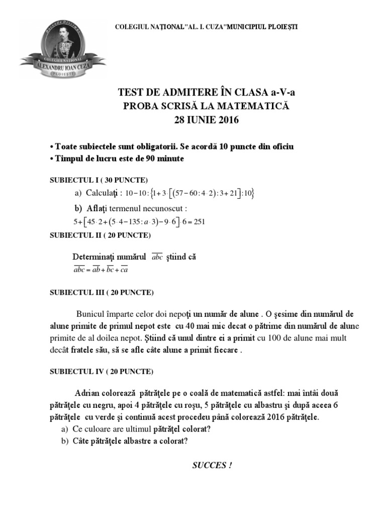 Subiectul 1 20 puncte. Test de admitere în clasa a v a probă scrisă la matematică 28 iunie 2016 notă. Colegiile naţionale din prahova au organizat concursul de admitere în clasa a v a astăzi fiind susţinută proba de matematică. Se acordă 10 puncte din oficiu.