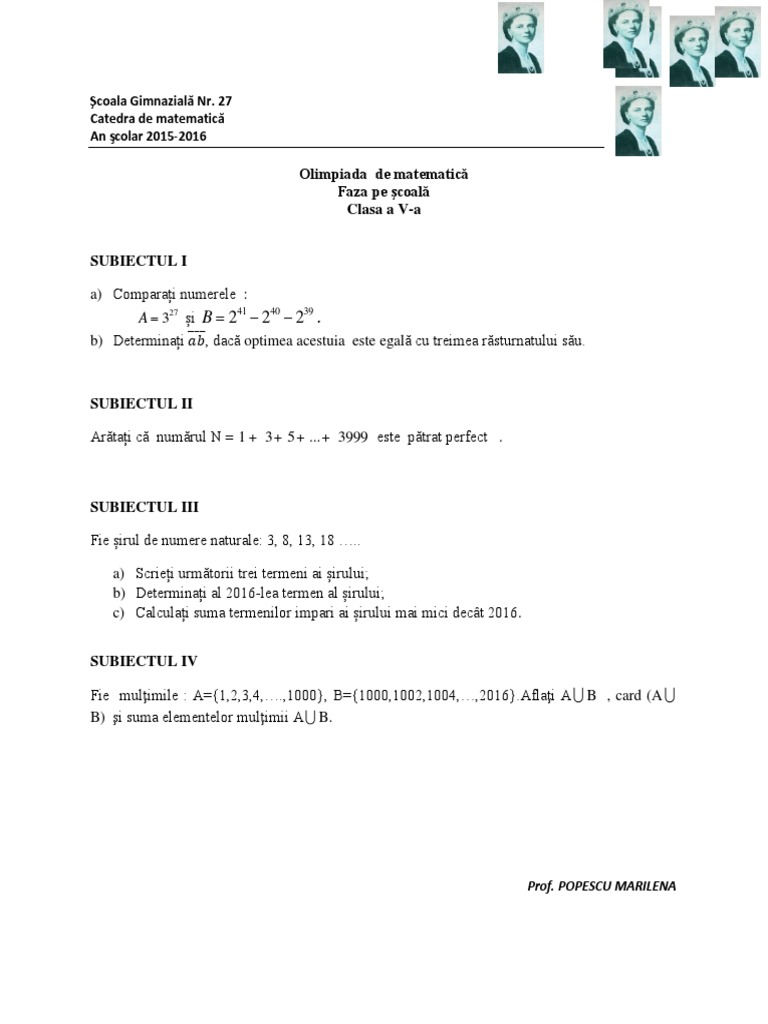 Subiecte olimpiada de matematica etapa pe scoala 2017. Olimpiada faza pe scoala clasa a 5 a. Olimpiada de chimie faza pe sector 5 elevi. Repartiţia pe săli se găseşte clasele 5 6 clasele 7 12.