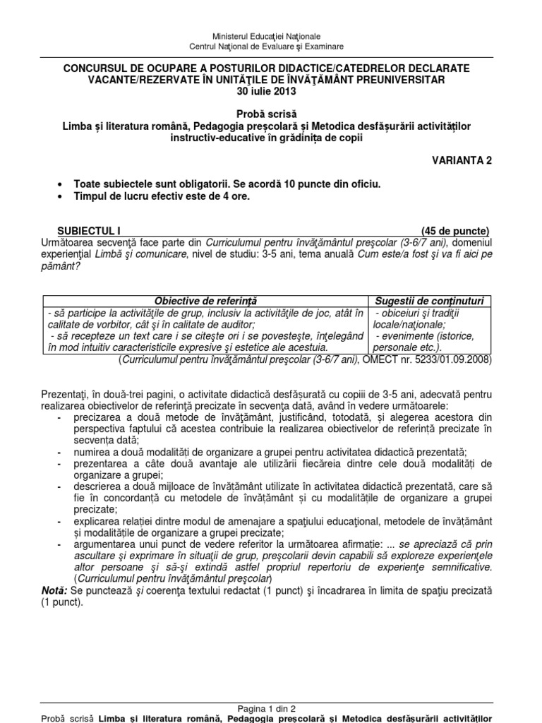 Pdf rezolvare subiecte educatori 2013 titularizare subiecte rezolvate titularizare și definitivat educatori rezolvare subiecte educatori 2013subiectul i pentru realizarea celor doua obiective am ales tema craciunul iar ca metode povestirea si turul galeriei. A principiul selectiei si al ierarhizarii cultural care consta in realizarea unei stranse legaturi intre domenii stiintifice si cultural ale umanitatii si domeniile curricumu ului scolar astfel disciplinele scolare au fost stabilite grupate si ierarhizate in categorii mai largi formandu se ariile curriculare. Subiecte din 2019 si informatii utile.