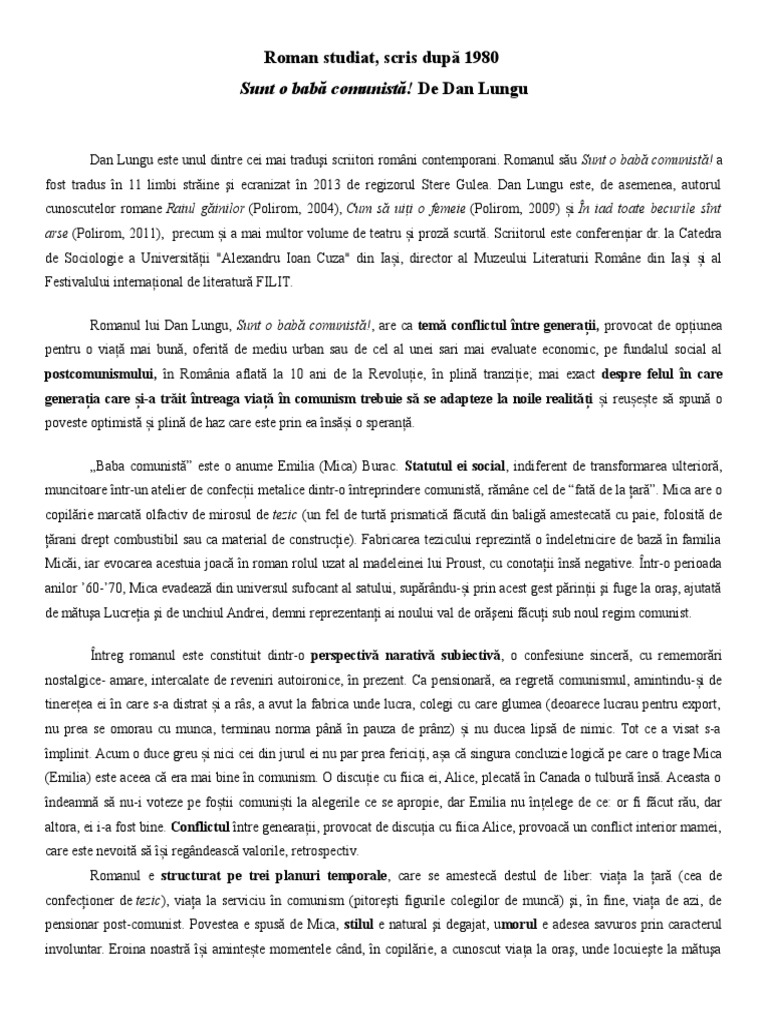 Recomandăm realizarea rezumatului romanului ținând cont de structura sa și accentuând doar cele mai importante elemente având în vedere faptul că romanul are o întindere mai lungă decât alte opere literare. Rating ul ar fi 3 5. Sint o baba comunista. Filmul are la bază romanul scris de către dan lungu în anul 2007.