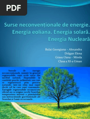 Surse de energie conventionale si neconventionale. Eu am numai 21 ani insa am invatat destul de multe si pe langa asta de la 7 ani am avut parintii despartiti si plecati in tari straine ddupa ce citesti. Resursele neregenerabile reprezintă niște surse de energie de energie importante deoarece din ele se obține cea mai mare parte a energiei electrice la nivel mondial la ora actuală. Cum numeroase surse neconventionale utilizeaza lumina valurile vintul caldura rezulta ca in conductorii electrici planetari se va afla energie electrica permanent. Rezervele de energie fiind in scadere sunt necesare si alte surse de energie pentru a face.