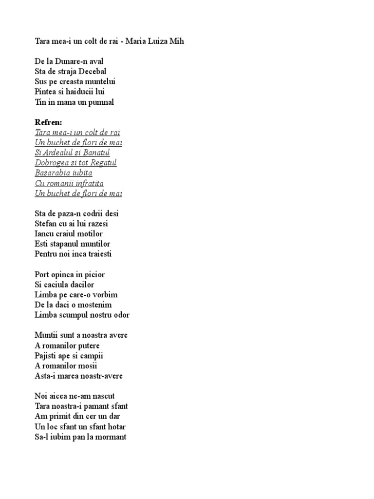 Tara mea i un colt de rai maria luiza mih. țara mea i un colț de rai de la dunăre n aval stă de strajă decebal sus pe creasta muntelui pintea și haiducii lui țin în mână un pumnal refren. Sta de paza n codrii desi. Tara mea i un colt de rai un buchet de flori de mai si ardealul si banatul dobrogea si tot regatul basarabia iubita cu romanii infratita un buchet de flori de mai.