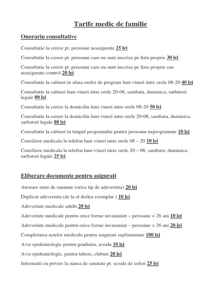 Tarife medic de familie 2018. Persoane care nu sunt inscrise pe lista proprie sau neasigurate control 20 lei consultatie la cabinet in afara orelor de program luni vineri intre. Serviciile medicale oferite persoanelor neasigurate se plătesc direct de către aceştia pe baza unor tarife prestabilite. Persoane neasigurate 25 lei consultatie la cerere pt. Declarații de avere 2019.
