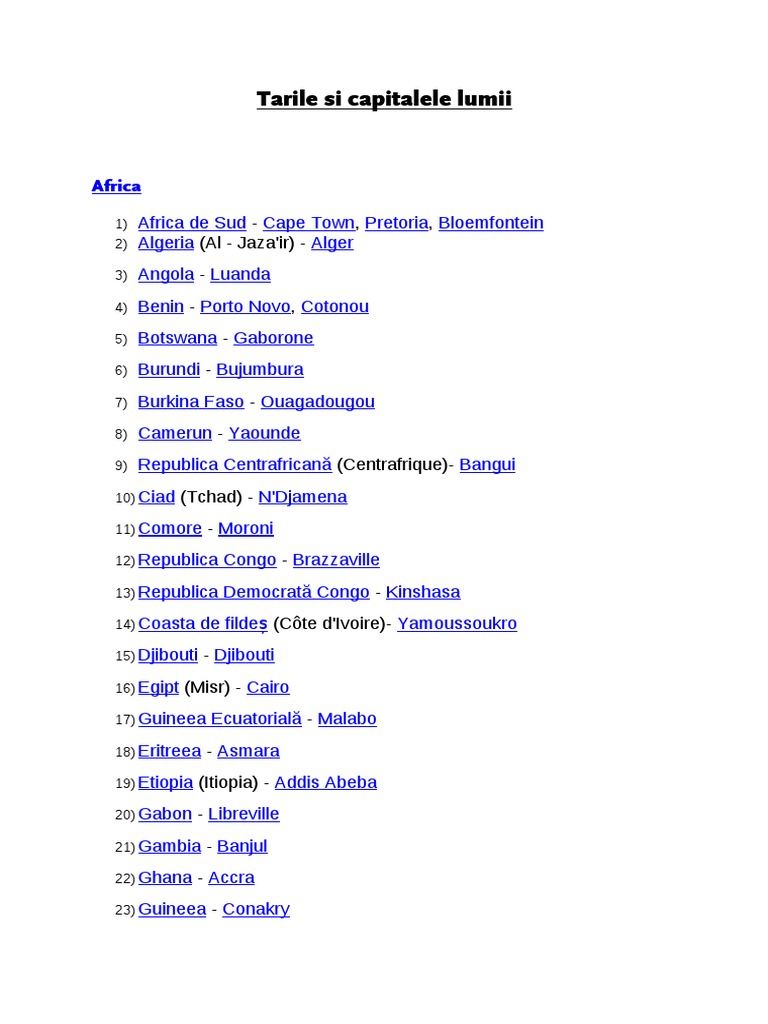 Africa de sud pretoria executivă cape town legislativă și bloemfontein judiciară algeria alger angola luanda benin cotonou executivă porto novo legislativă botswana gaborone burundi gitega burkina faso ouagadougou camerun yaoundé capul verde praia. Aici veți gasi toate capitalele lumii. Lista ţărilor din lume după continente împreună cu capitala lor continentul africa africa de sud cape town pretoria bloemfontein algeria al jaza ir alger angola luanda benin porto novo cotonou botswana gaborone burundi bujumbura burkina faso ouagadougou camerun yaounde republica centrafricană centrafrique bangui ciad tchad n djamena comore. Capitalele lumii tarile lumii lista ţărilor din lume după continente împreună cu capitala lor continentul africa africa de sud cape town pretoria bloemfontein algeria al jaza ir alger angola luanda beni.