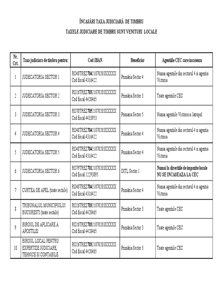 1 taxele judiciare de timbru se plătesc de debitorul taxei în numerar prin virament sau în sistem on line într un cont distinct de venituri al bugetului local taxe judiciare de timbru şi alte taxe de timbru al unităţii administrativ teritoriale în care persoana fizică are domiciliul sau reşedinţa ori după caz în care persoana juridică are sediul social. Calculator taxa de timbru potrivit oug 80 2013. Sector 6 d i t l sector 6 ro92trez70621070203xxxxx deschis la trezoreria sector 6 cod fiscal 12380248. Sectorul de domiciliu sediu debitorului de taxa beneficiar cont iban informatii suplimentare.
