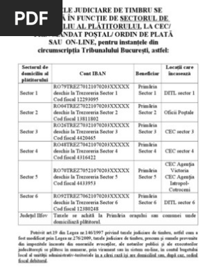 Potrivit art 19 din legea nr 146 1997 privind taxele judiciare de timbru astfel cum a fost modificat prin legea nr 276 2009 taxele judiciare de timbru precum şi sumele provenite din impozitele încasate din onorariile avocaţilor ale notarilor publici şi ale executorilor judecătoreşti se plătesc în numerar prin virament sau în sistem on line în contul bugetului local al. 1 taxele judiciare de timbru se plătesc de debitorul taxei în numerar prin virament sau în sistem on line într un cont distinct de venituri al bugetului local taxe judiciare de timbru şi alte taxe de timbru al unităţii administrativ teritoriale în care persoana fizică are domiciliul sau reşedinţa ori după caz în care persoana juridică are sediul social. Taxe locale sector 5 ro70trez70521070203xxxxx deschis la trezoreria sector 5 cod fiscal 33632364 site ul ditl. 4 în spatele benzinăriei favorit tel.