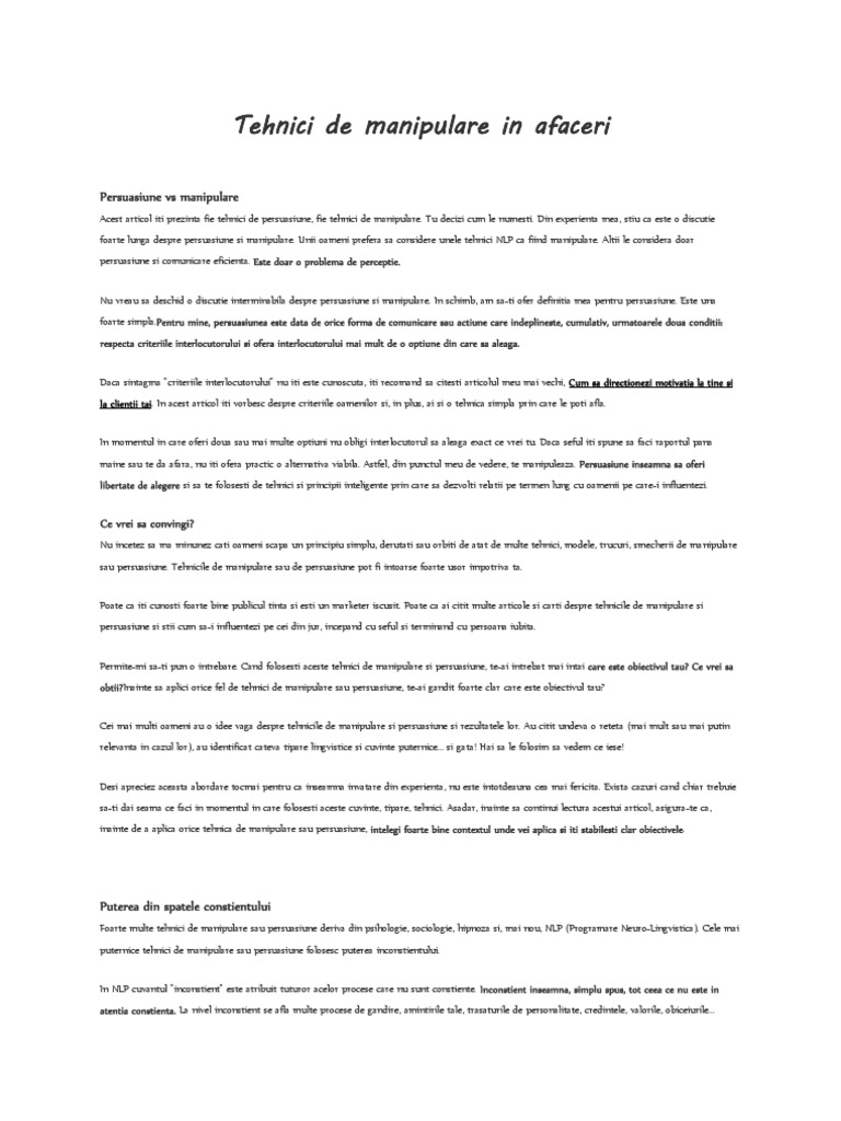 A cunoaste adversarul a i cunoaste tehnicile de manipulare este indispensabil pentru a ne elibera de robie. Să accesăm surse diverse să ascultăm și opiniile care ne sunt poate incomode să avem mintea deschisă la date și fapte și închisă la tehnicile de. Toţi cei care deţin puterea indiferent în ce domeniu au ca principal obiectiv să schimbe gândirea şi implicit comportamentul celor pe care îi conduc. Există voci mai mult sau mai puţin otevistice care susţin că deciziile oamenilor sunt controlate de guverne sau organizaţii oculte cu ajutorul televiziunii sau a internetului.