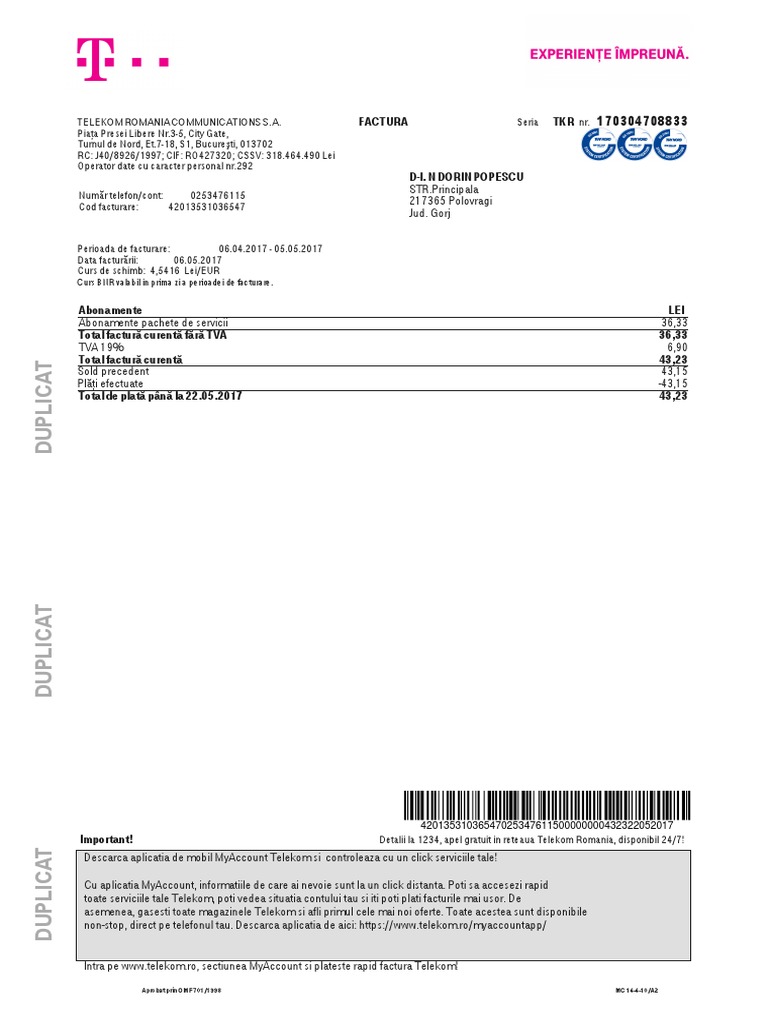 0 95 minim 1 ron. Doar scanezi codul de bare de pe factura. Poți câștiga super premii. Totul e mai simplu cu myaccount telekom.