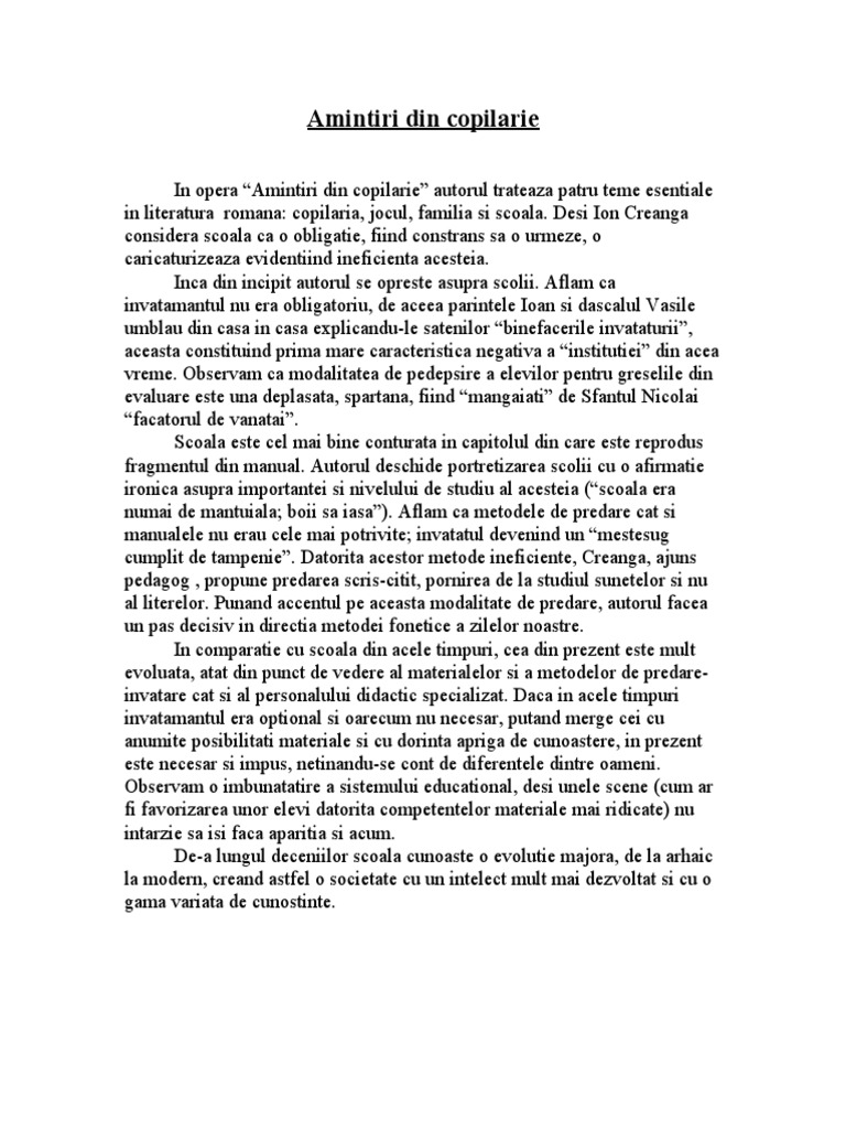 Prin nica scriitorul prezinta istoria unei copilarii din mediul taranesc mai bine spus din moldova sfarsitului de secol xix de la primii ani de scoala si pana la despartirea de satul natal. Amintiri din copilărie este un roman autobiografic romanul formării personalităţii unui tânăr şi un bildungsroman care prezintă procesul. 1 martie 1837 humulești jud. în 1881 ianuarie partea i în aprilie partea a ii a şi în 1882 martie partea a iii a ultima parte fiind publicată postum în 1892.