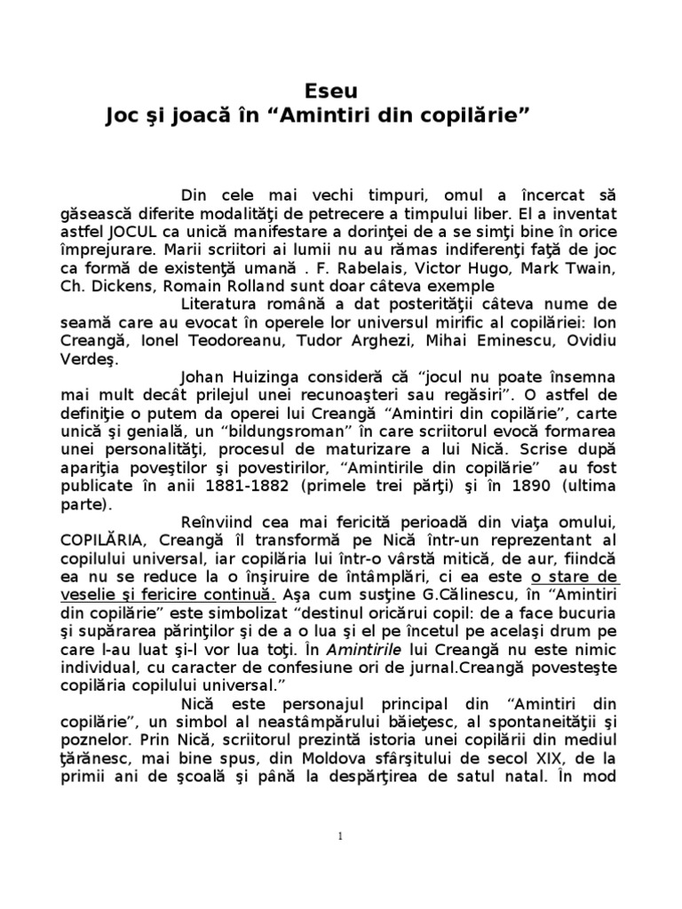 Cea a copilarie jocului si joaca si semnificatiile ei. Amintiri din copilarie in care este povestita copilaria copilului universal idee reliefata de autorul insusi atunci cand afirma. El descrie lumea copilariei ca pe un taram al jocului. Opera amintiri din copilărie de ion creangă apare în revista convorbiri literare astfel.