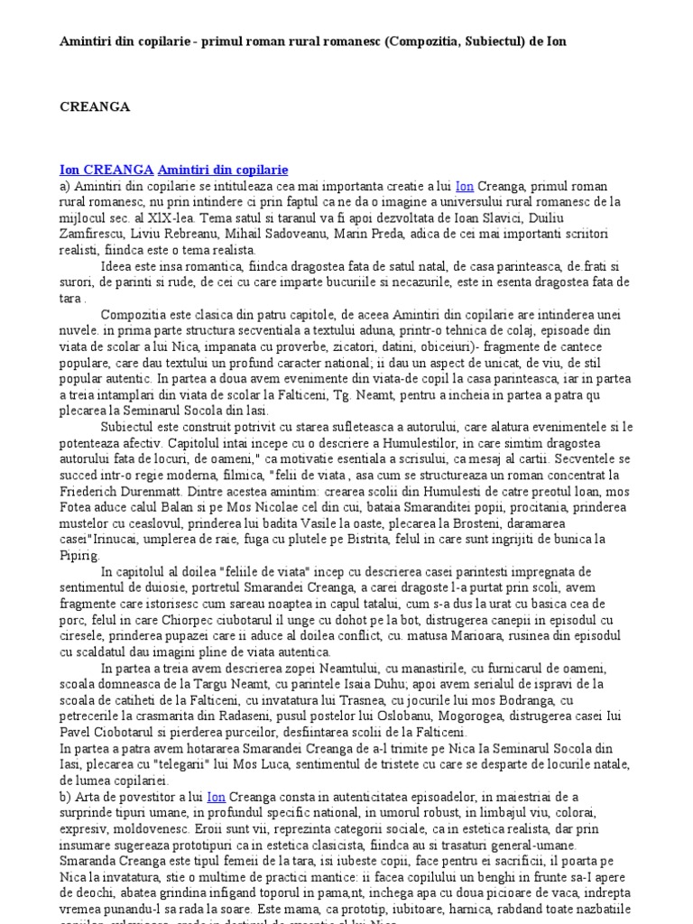 Ion creangă considerat unul dintre marii clasici ai literaturii române recunoscut datorită măiestriei sale în ceea ce priveşte talentul de povestitor a intrat în istoria literaturii române datorită operei autobiografice amintiri din copilărie. Folosind un procedeu compoziţional specific autorul evocă universul vieţii ţărăneşti. Amintiri din copilărie este fără îndoială cea mai cunoscută dintre operele lui ion creangă. Amintiri din copilarie este un roman al copilariei taranesti primul de acest fel din literatura romana care prin intermediul lui nica prezinta istoria copilariei lui incepand cu primii a ni de scoala pana la despartirea de satul natal eveniment ce produce maturizarea romanul este impartit in patru capitole distincte cu povestiri independente dar care au o unitate deplina diferitele.