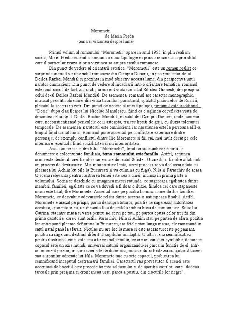 Tema si viziunea despre lume in morometii. Primul roman scris de marin preda moromeii este alctuit din dou volume publicate la doisprezece ani distan. Eseu tema i viziunea despre lume moromeii de marin preda. Tema și viziunea despre lume reprezintă una dintre cele mai populare cerințe regăsite în cadrul subiectului al iii lea al examenului de bacalaureat la limba și literatura română așadar dacă ești în clasa a xii a și ai început să te pregătești pentru bac te sfătuim să citești și să încerci să înțelegi în mod logic modelele rezolvate de eseuri despre tema și. Tema si viziunea despe lume plumb george bacovia plumb simbolismul apare la sfarsitul sec xix in franta ca produsul acelui mal de siècle apare ca reactie impotriva retorismului romantic si impersonalitatii parnasiene.