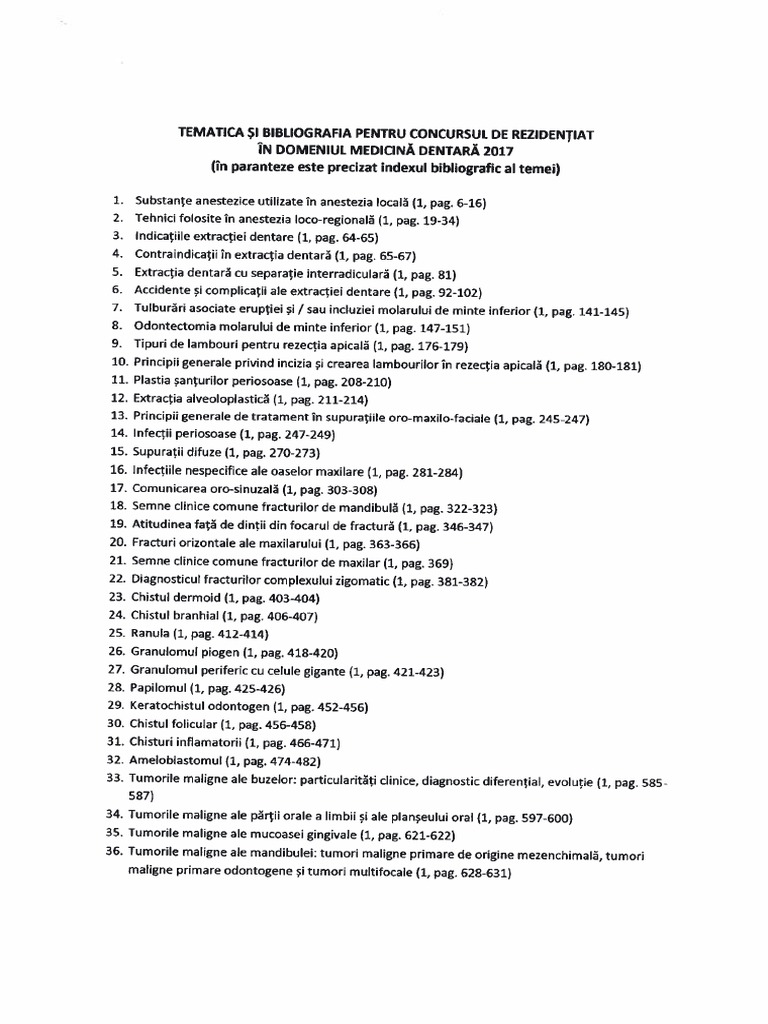 In toate cele 6 centre universitare au fost scoase la concurs aproape 4000 de locuri si posturi. Doar umf victor babes timisoara a anuntat ca organizeaza pentru studentii anilor terminali anul vi facultatea de medicina si medicina dentara anul v facultatea de farmacie sambata 8 aprilie 2017 ora 9 am simularea examenului de rezidentiat. Tematica și bibliografia pentru concursul de rezidențiat în domeniul medicină dentară 2019 în paranteze este precizat indexul bibliografic al temei 1. Bibliografie rezidentiat medicina dentara.