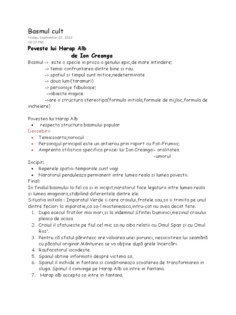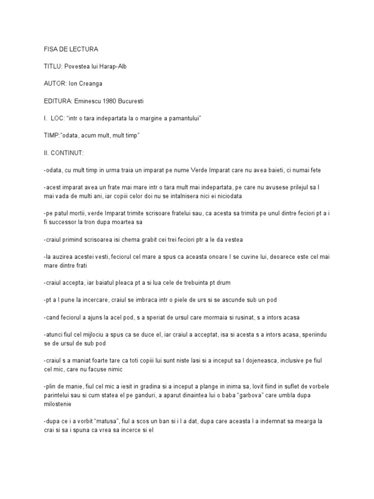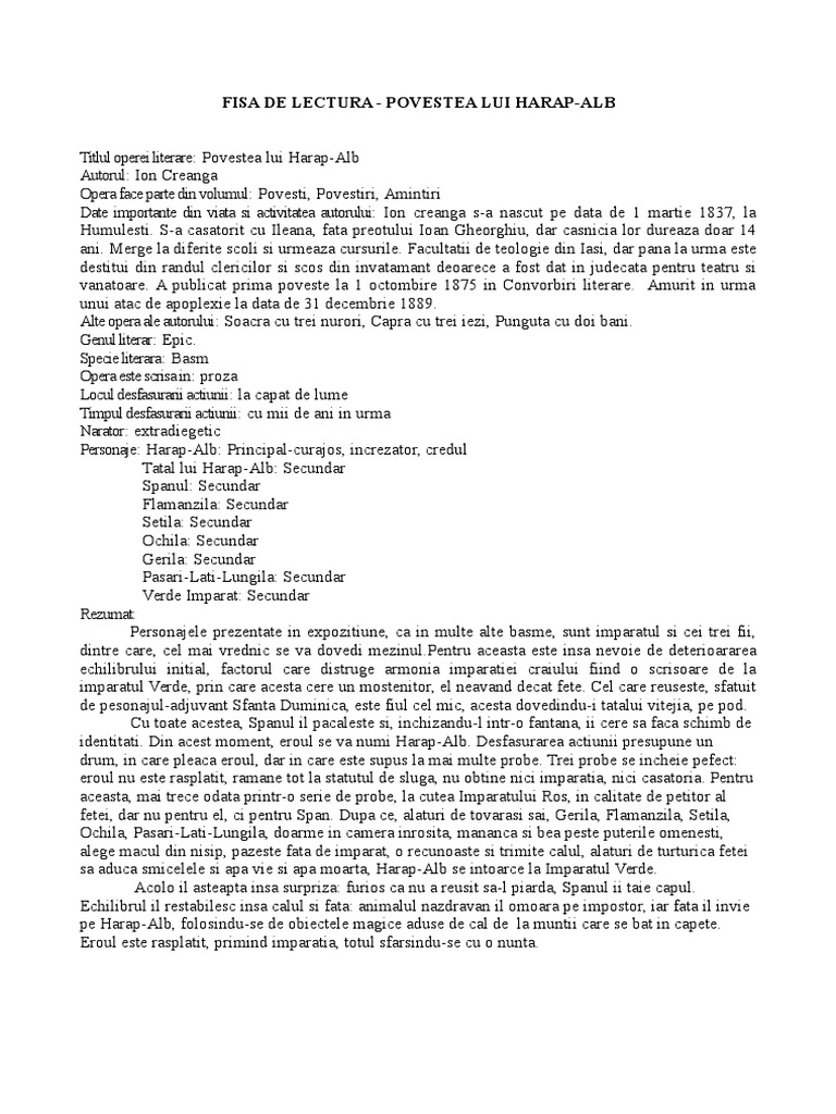 Fiș de lectura conține un rezumat destul de lung care spune povestea fiului de imparat harap alb contine detalii despre timpul şi locul desfăşurării acţiunii si prezinta personajele principale din basm si se inceie cu parerile personale ale autorului fișei de lectura cel care a lecturat povestea lui harap. 0 0 au considerat acest document util bifați acest document drept util. Cum l considera mpratul pe fiul su cel mic. învăţământ liceal limba şi literatura român ă.