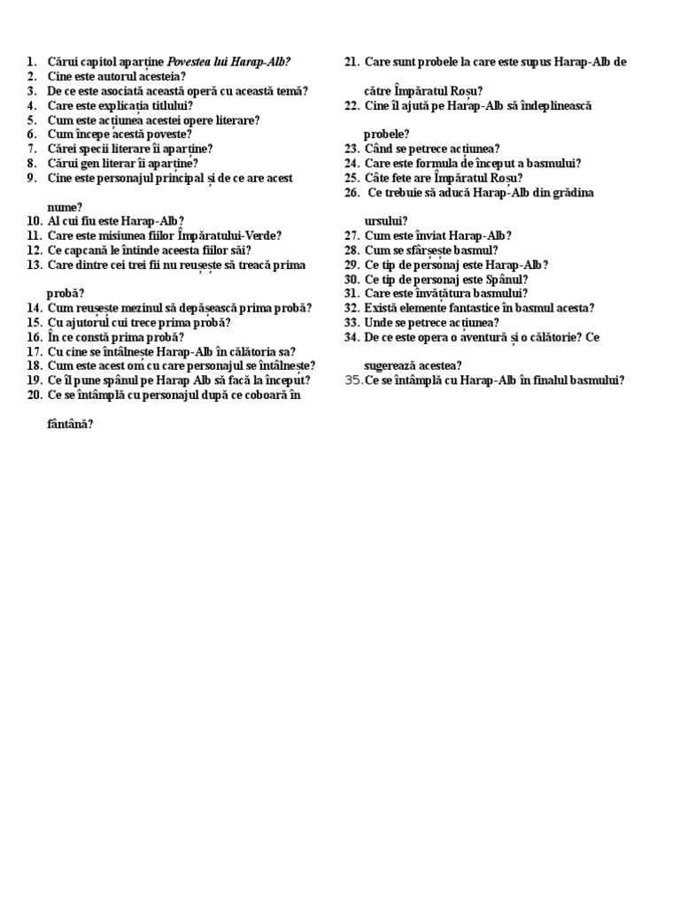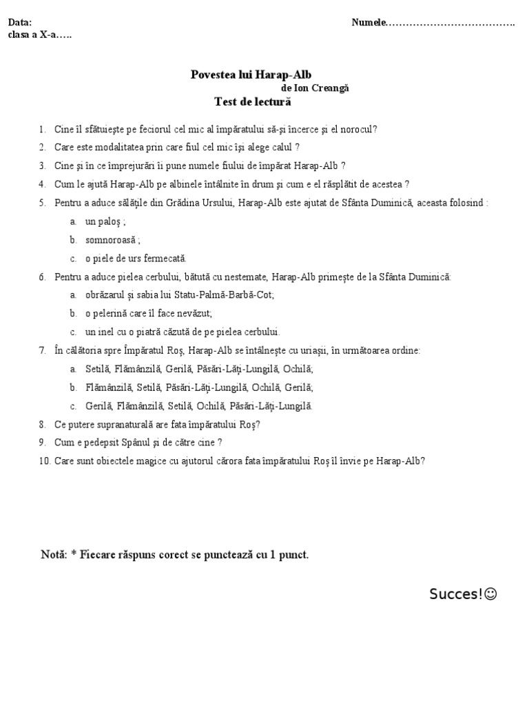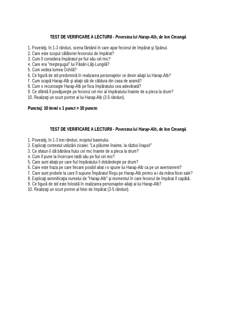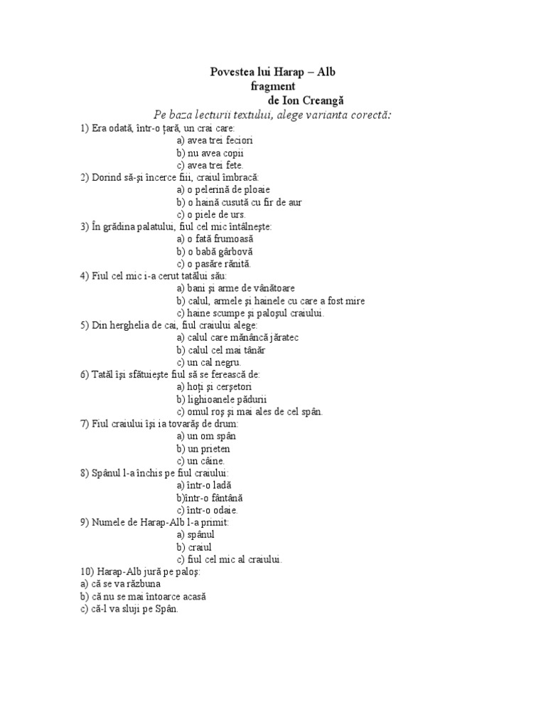 învăţământ liceal limba şi literatura română teste clasa a 10 a. 1 a spus mulţumesc. Test de lectura povestea lui harap alb nr 2. Fisa de lectura pentru basmul povestea lui harap alb scris de ion creangă.