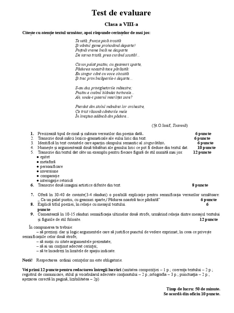 Recunoaşterea în textul citat a elementelor de versificaţie şi a unei figuri de stil. Citeşte cu atenţie textul următor. Test la limba şi literatura românăciteşte cu atenţie textul următor prin vişini vântul în grădinăcătând culcuş mai bate abiadin aripi şi n curând s alină iar roşul mac închide floarea din ochi clipeşte ncet cicoareaşi adoarme apoi şi ea eu cred c a obosit pădurea căci ziua ntreag a tot cântatşi tace acum gândind aiurea sub dealuri amurgeşte zarea se ntunecă prin. Teste clasa a viii a.