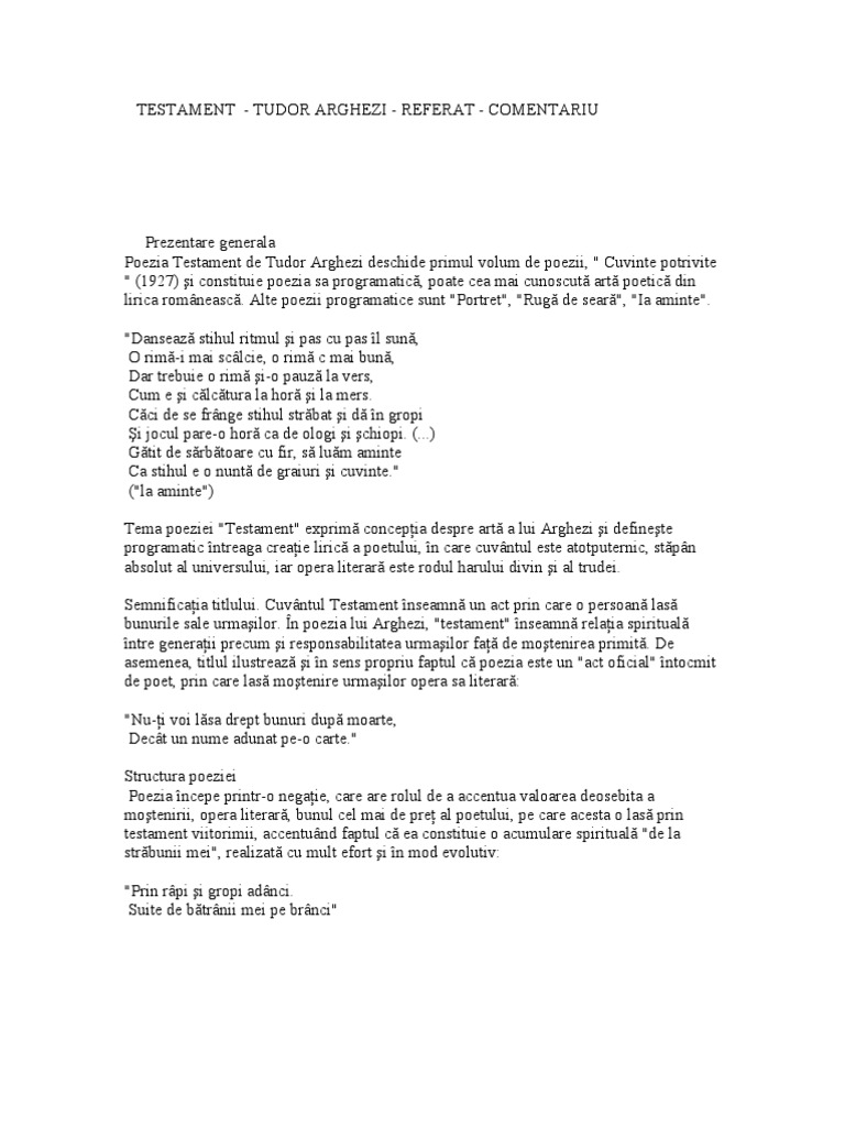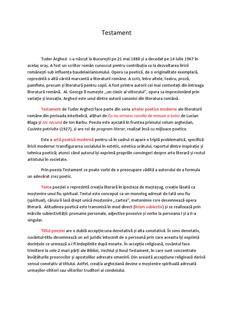 Această precizare este esențială. Tudor arghezi pe numele adevărat ion n. Testament de tudor arghezi comentariu literar eseuri testament de tudor arghezi comentariu literar. Testament de tudor arghezi face parte din seria artelor poetice moderne ale literaturii romane din perioada interbelica alături de eu nu strivesc corola de minuni a lumii de lucian blaga si joc secund de ion barbu poezia este așezata in fruntea primului volum arghezian cuvinte potrivite 1927 si are rol de program literar.