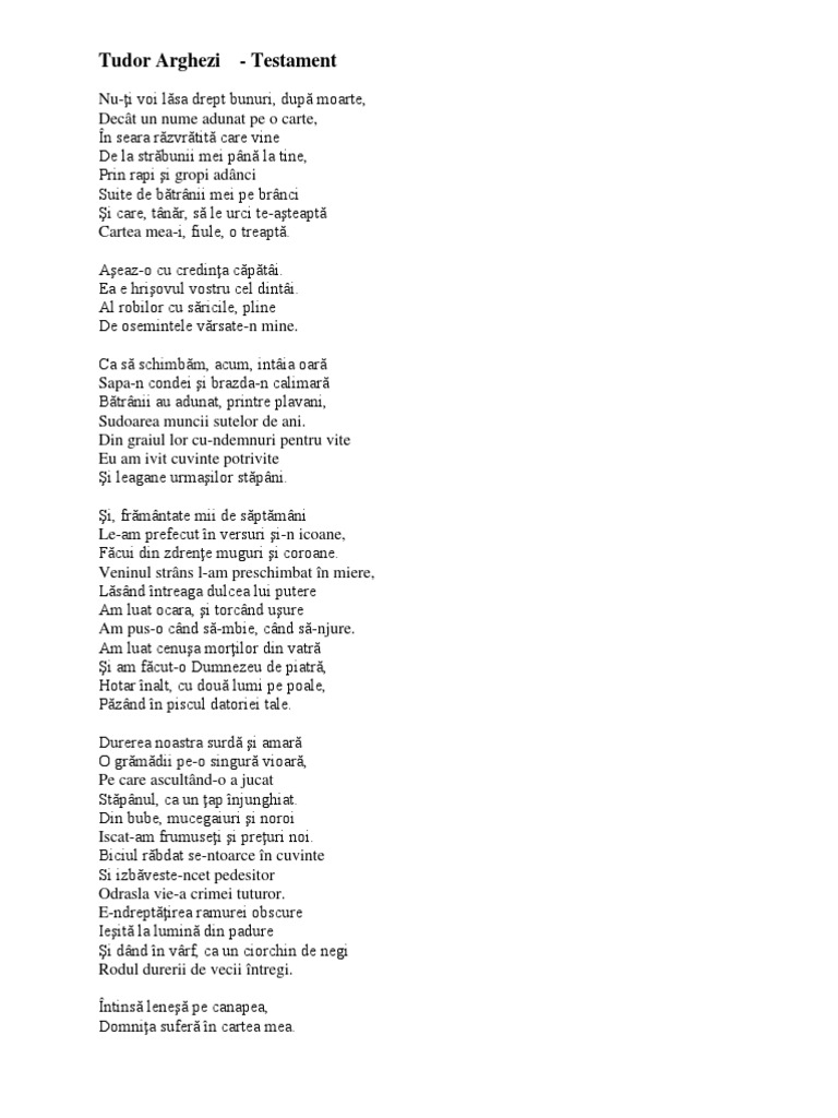 Nu ţi voi lăsa drept bunuri după moarte ii. Comenta i primele dou ă versuri. Citi i cu aten ie strofa a ii a. Tudor arghezi testament geneza situat la inceputul volumului cuvinte potrivite aparut in 1927 volum ce marcheaza adevaratul debut arghezian şi totodatã da expresie deplinei maturitãţi creatoare poemul da expresie acelor principii care in viziunea poetului guverneaza creatia artistica.