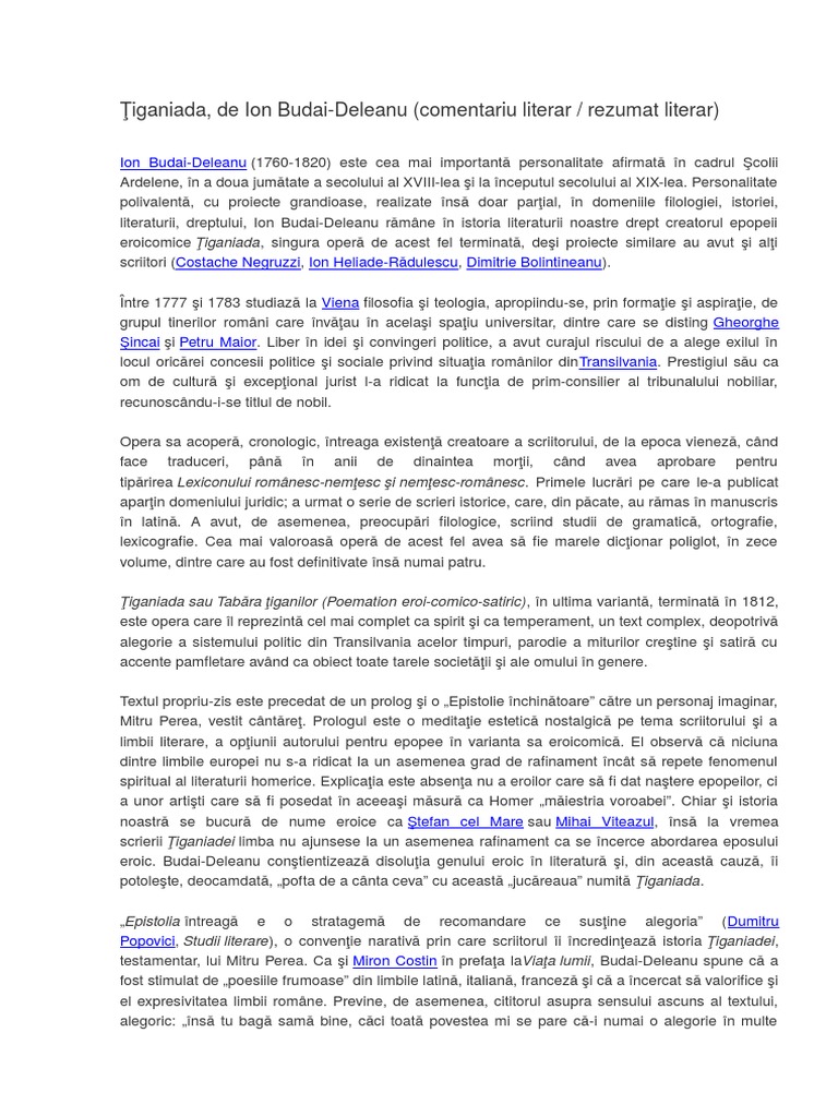 și accentuând cele mai importante elemente din aceasta. 90 70 90 au considerat acest document util 70 voturi 146k vizualizări 10 pagini. țiganiada sau tabăra țiganilor ediție definitivă de jacques byck 1800 1812 este prima epopee în limba română fiind scrisă de ion budai deleanu un reprezentant al școlii ardelene. ţiganiada de ion budai deleanu comentariu literar rezumat literar ion budai deleanu 1760 1820 este cea mai importantă personalitate afirmată în cadrul şcolii ardelene în a doua jumătate a secolului al xviii lea şi la începutul secolului al xix lea.