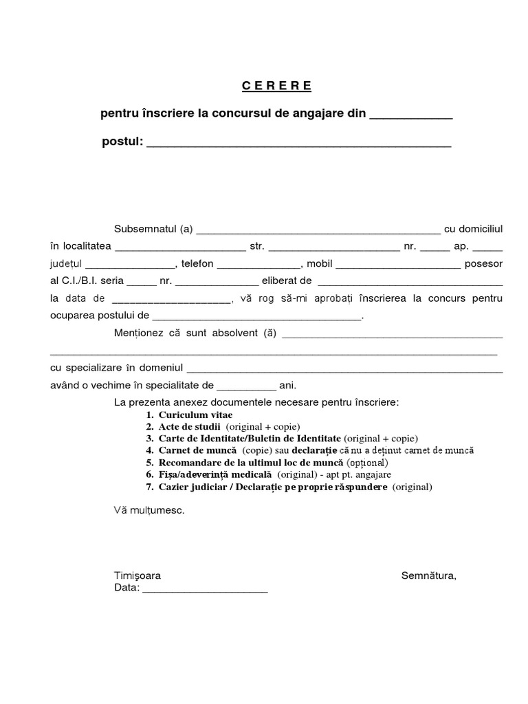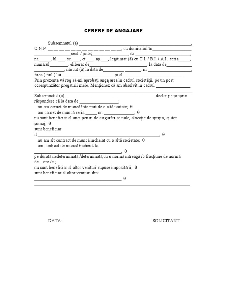 Tip cerere de angajare. Cerere de divort november 16 2012 10 39 am jump to comments. Procesul de angajare este un proces foarte greoi in conditiile actuale. In sectorul public aplicatiile la locurile de munca scoase la concurs se fac insotite de cereri de angajare. El își stabilește singur programul de lucru iar angajatorul are dreptul să verifice activitatea salariatului în condițiile stabilite prin contractul.