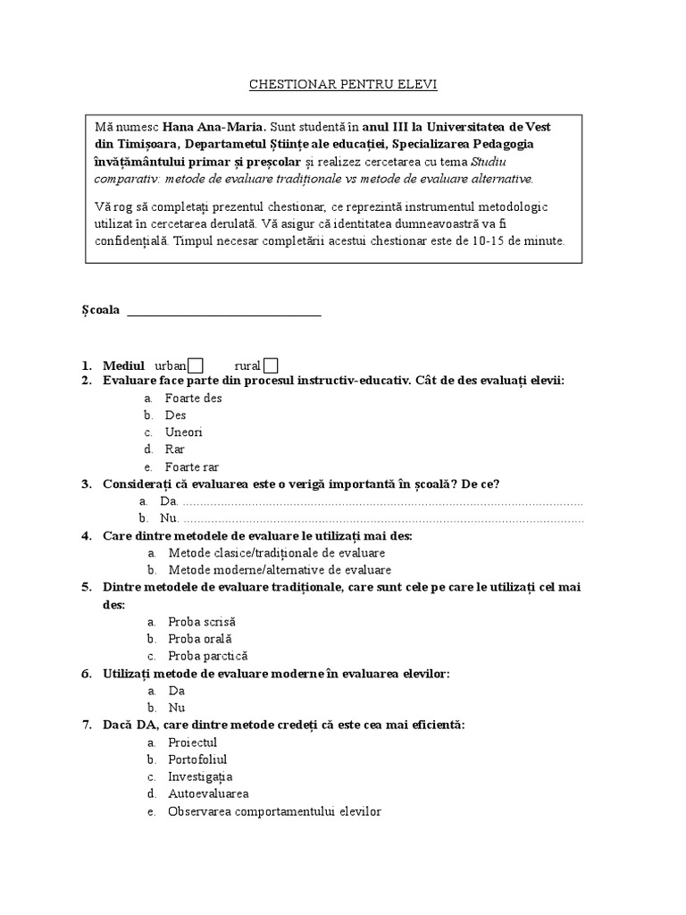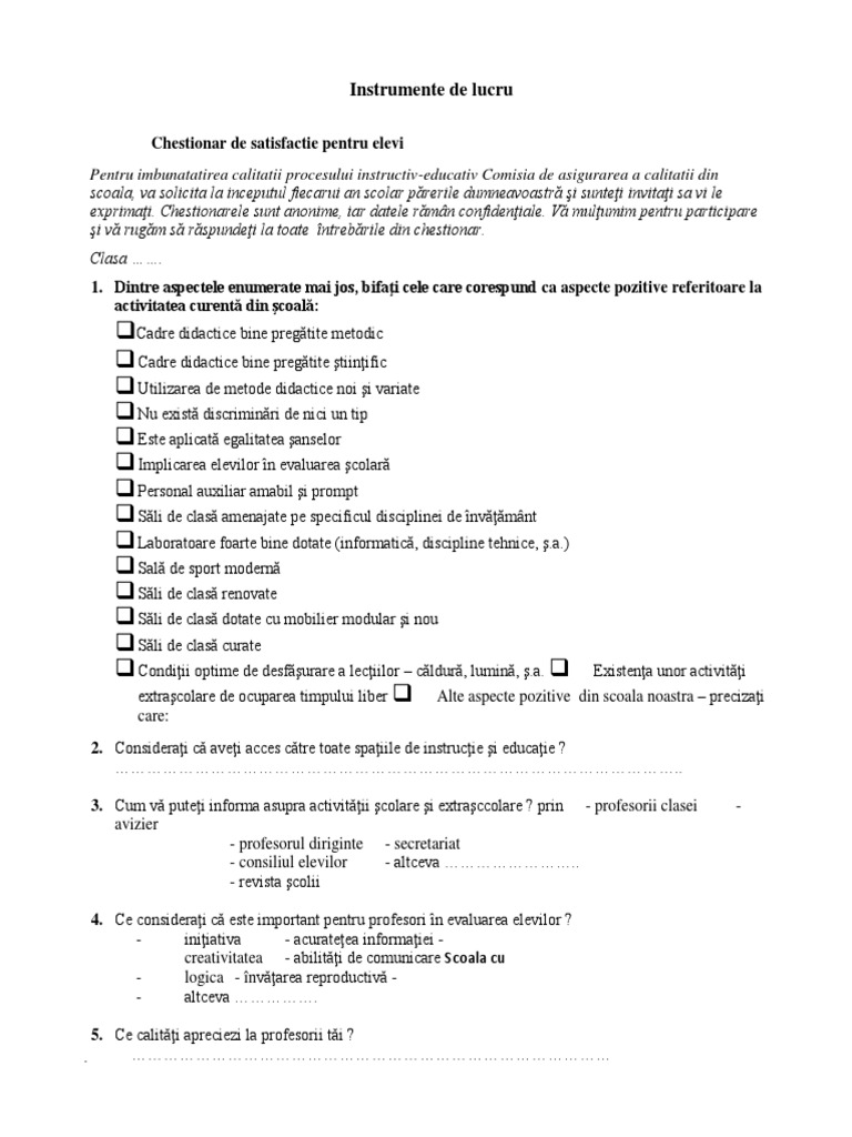 Tipuri De Chestionare Pentru Elevi