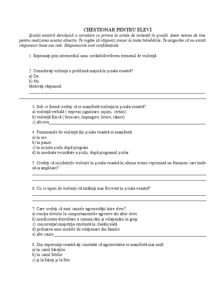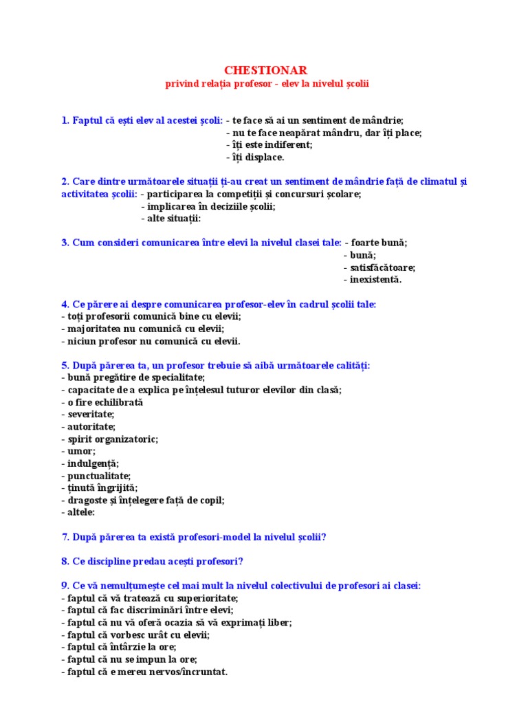 Tipuri de chestionare pentru elevi. Se poate adapta si eventual prezenta concluziile chestionarului la o sedinta cu parintii. 21 noiembrie 2011 07 45. Profil de personalitate al elevului creativ profesor maria ritivoi colegiul economic emanuil gojdu hunedoara lucrarea prezintă un profil de personalitate al elevului de liceu care învaţă discipline economice. Trebuie pentru buna desfășurare a opționalelor de exemplu.