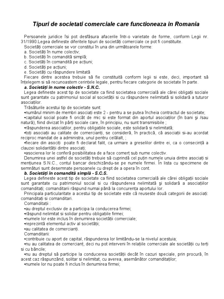 Inregistrarea inmatricularea societatii comerciale in registrul comertului are rol constitutiv. Acest referat descrie tipuri de societati comerciale care functioneaza in romania. începând cu data de 01 01 2011 potrivit legislației române noțiunea de comerciant a fost inclusă in notiunea mai largă de profesionst cu scop lucrativ. Societate în nume colectiv societate în comandită simplă societate pe acțiuni societate în comandită pe acțiuni societate cu răspundere limitată.