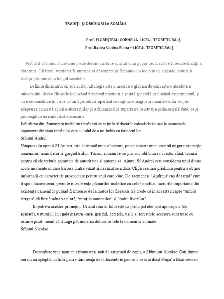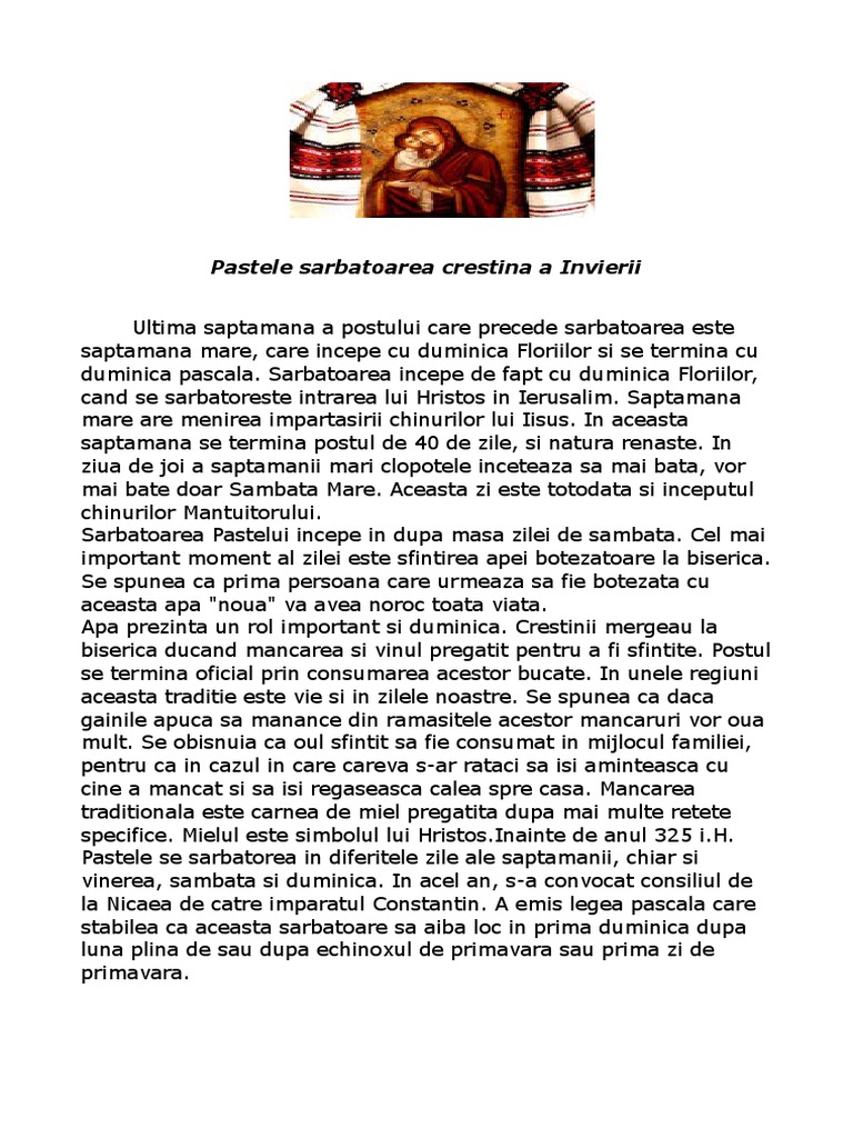 Traditii si obiceiuri de paste referat. începutul acestei sarbatori e vazut chiar în cina cea de taina pâinea si vinul simbolizând sacrificiul trupului si al sângelui ca pret al rascumpararii. De asemenea se spune ca cei care mănâncă miel n au voie sa dea oasele la câini ci trebuie să le îngroape sub un măr iar cojile de ouă se dau pe apă. Ie brau catrinta poale cojocel ornamentate cu diferite motive traditionale florale si marama sau batista care era alba. Obiceiuri romanesti de paste.
