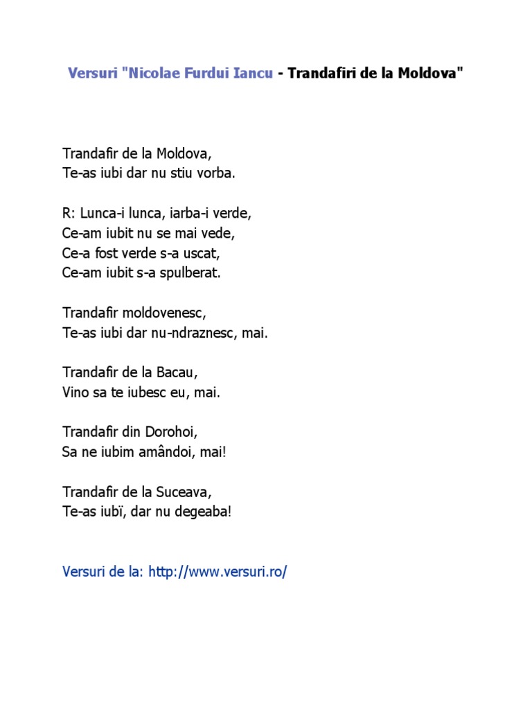 Ce am iubit s a scuturat. Trandafir moldovenesc te as iubi dar nu ndraznesc mai. Nicolae furdui iancu versuri trandafiri de la moldova trandafir de la moldova te aş iubi dar nu ştiu vorba lunca i luncă iarba i verde ce am iubit nu se mai vede ce a fost verde s a uscat ce am iubit s a nicolae furdui iancu trandafiri de la moldova lyrics. Trandafir de la moldova te as iubi dar nu stiu vorba.