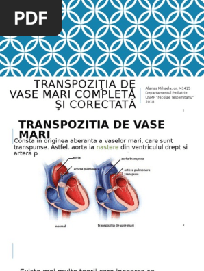 Transpozitia de vase mari. Confirmare diagnostic nastere nou născut plamani tratament vase. Transpozitia vaselor mari tvm este un tip de malformatie cardiaca congenitala in care cele doua artere mari artera pulmonara si aorta sunt inversate adica aorta iese din ventriculul drept al inimii si primeste sange albastru care este trimis inapoi in corp fara a fi oxigenat iar artera pulmonara iese din ventriculul stang primeste sange rosu si il trimite iar in plamani. Operaţia ideală în acest caz este schimbarea arterială cu închiderea defectului de sept ventricular. Născutul este cianozat buzele şi unghiile îi sunt violacee.