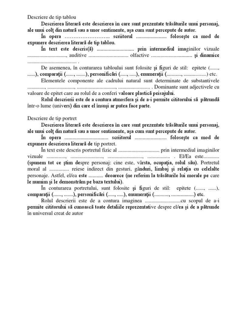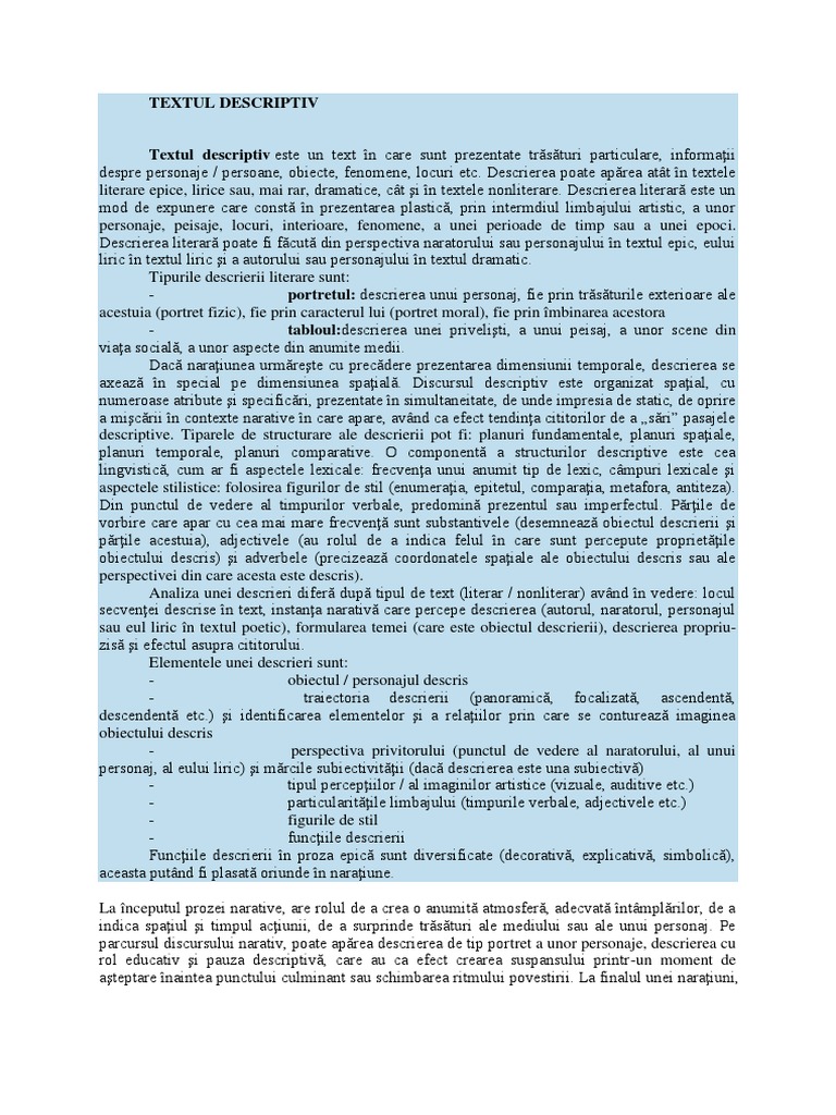 Trasaturi ale descrierii de tip portret. Noaptea retrasă în văi și în desimea posomorâtă a brazilor cernea munții adormiți și visători ale căror piscuri neguroase păreau că formează hotarele înalte dintre pământ și cer. Deci portretul este imaginea unei persoane ori a unui personaj literar si poate sa apartina sau nu unei opere literare. Portretul este un tip de descriere in care sunt infatisate trasaturile fizice sau morale ale unei persoane in scopul individualizarii ei. In cuprins se desfac elementele componente ale peisajului si se descrie apoi fiecare detaliu al acestora.