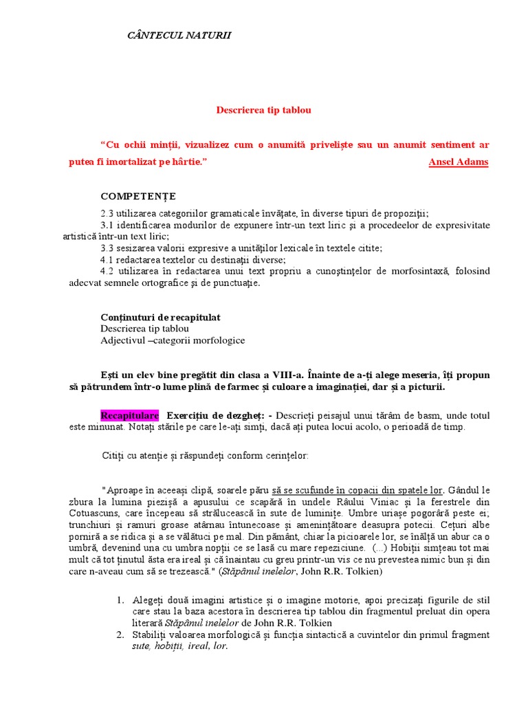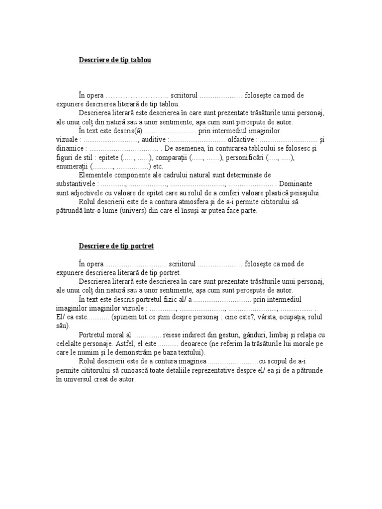 Cand persoana apare intr o opera literara ea devine personaj literar. De tip tablou descrierea unei furtuni unui lac unui anotimp unui obiect etc. Cât de frumoasă era luna și cât de senină fu noaptea aceea. Descrierea este un mod de expunere prin care se prezintă trăsăturile caracteristice ale unui colț din natură ale unui peisaj fenomen al naturii portretul unui personaj etc.