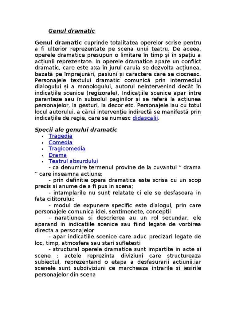 Scene acte sau tablouri. Genul dramatic cuprinde totalitatea operelor în versuri sau în proză create special pentru a fi reprezentate pe scenă. Operele dramatice au la bază o limitare în timp și spațiu a acțiunii reprezentate iar personajele textului dramatic comunică prin intermediul dialogului și monologului autorul fiind prezent doar în indicațiile regizorale. Genul dramatic 01 comedia tragedia drama sunt specii ale genului dramatic.