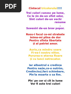 Trei culori cunosc pe lume. Se înalță ca un astru gloriosul meu popor. Roşu i focul vitejiei jertfele ce n veci nu pier galben aurul câmpiei şi albastru al nostru cer. Multe secole luptară străbunii noştri eroi. Cât pe cer şi cât pe lume vor fi aste trei culori vom avea un falnic nume şi un falnic viitor.