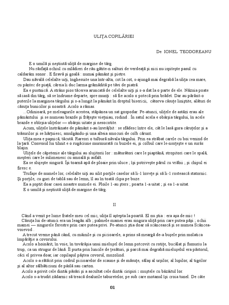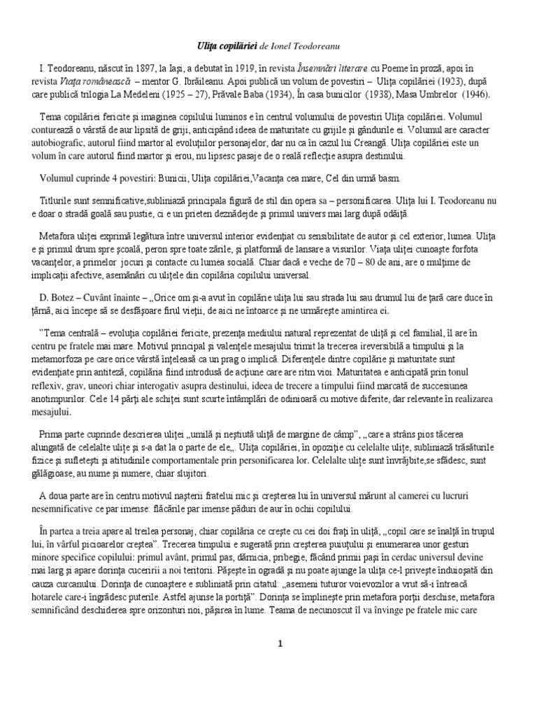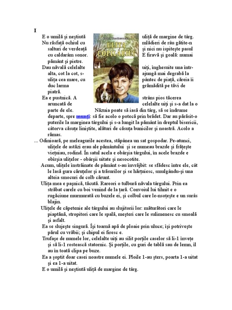 Era intiiul avint putea urcindu se pe sciunel si qi moaie degetul in gavanosul cu dulceala de pe misufa ca mai apoi dupi ce gi l a supt el sil intindn qi. Ulita copilariei ionel teodoreanu. Nu răsfaţă ochiul cu mlădieri de râu gătite n salturi de verdeaţă şi nici nu ispiteşte pasul cu caldarâm sonor. Copilul îi ştia numele dar nu i ştia rostul.