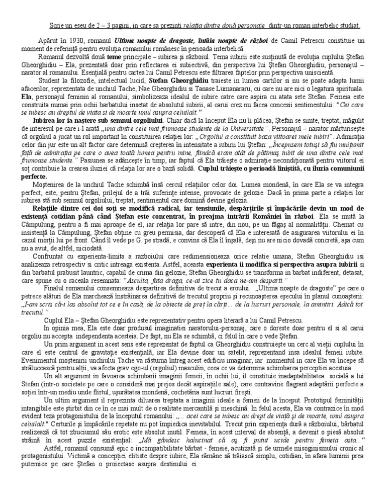 Ultima noapte de dragoste intaia noapte de razboi relatia dintre doua personaje. Referat despre relatiile dintre doua personaje ultima noapte de dragoste intaia noapte de razboi prin insasi tema sa romanul ultima noapte de dragoste intaia noapte de razboi ilustreaza modul in care autorul incearca sa analizeze impactul evenimentelor asupra constiintei personajului si implicit modul in care experienta razboiului modifica relatia dintre cele doua personaje. Ultima noapte de dragoste întâia noapte de război este şi un roman subiectiv prin naraţiunea este la persoana i naratorul fiind şi personaj al acţiunii literatura propusă de camil petrescu fiind una autentică bazată pe sondarea propriei conştiinţe a propriului eu. Nu scriu decât ceea ce văd ceea ce aud ceea ce înregistrează simţurile mele. Pentru a ți face o imagine mai clară despre romanul ultima noapte de dragoste întâia noapte de război este important să urmărești evoluția relației dintre protagonistul ștefan gheorghidiu și soția acestuia ela.