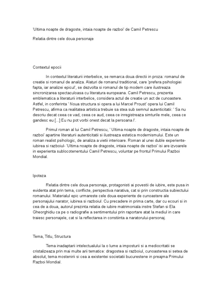 Ultima noapte de dragoste întâia noapte de război este un roman scris de camil petrescu și publicat în 1930 autorul surprinde drama intelectualului lucid însetat de absolutul sentimentului de iubire dominat de incertitudini care se salvează prin conștientizarea unei drame mai puternice aceea a omenirii ce trăiește tragismul unui război absurd văzut ca iminență a morții. Autorul recurge la personajul narator şi la perspectiva actorială înlocuind naratorul omniscient şi perspectiva auctorială. Romanul dezvoltă două teme principale iubirea şi războiul tema iubirii este susţinută de evoluţia cuplului ştefan. Read story ultima noapte de dragoste relatia dintre 2 personaje by vladbodareu vlad bodareu with 49 052 reads proza romanelor lui camil petrescu a produs un.