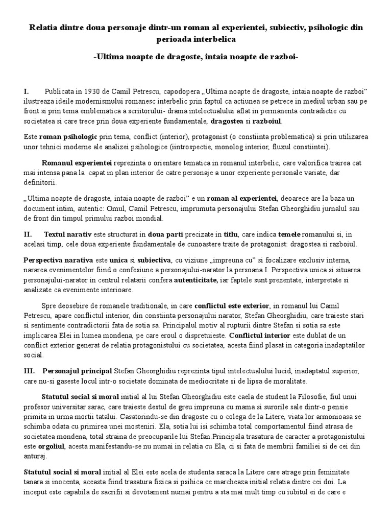 Romanul subiectiv modern ultima noapte de dragoste întâia noapte de război de camil petrescu romanuleste specia genului epic în proză de mare întindere cu acţiune complexă care se poate desfăşura pe mai multe planuri cu personaje numeroase bine individualizate. Camil petrescu pledeaza pentru o estetica a autenticitatii. Romanul psihologic ultima noapte de dragoste întâia noapte de război de camil petrescu roman interbelic. Autorul recurge la personajul narator şi la perspectiva actorială înlocuind naratorul omniscient şi perspectiva auctorială.