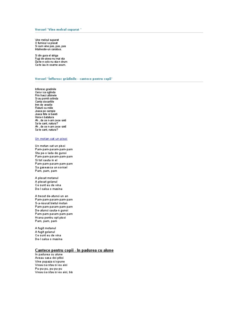 Un motan cât un pisoi versuri. Un motan cat un pisoi cu versuri a fost adăugat în ziua de 27 septembrie 2013 și este un articol care aparține de categoria cantece de gradinita cantece despre animale. Cantece pentru copii un motan cat un pisoi. Un motan cat un pisoi pam pam param pam pam sta pe o lada de gunoi pam pam param pam pam si tot cauta in el pam pam param pam pam sa gaseasca un soricel. A plecat motanul a plecat golanul ce sunt eu de vină de l calcă o maşină.