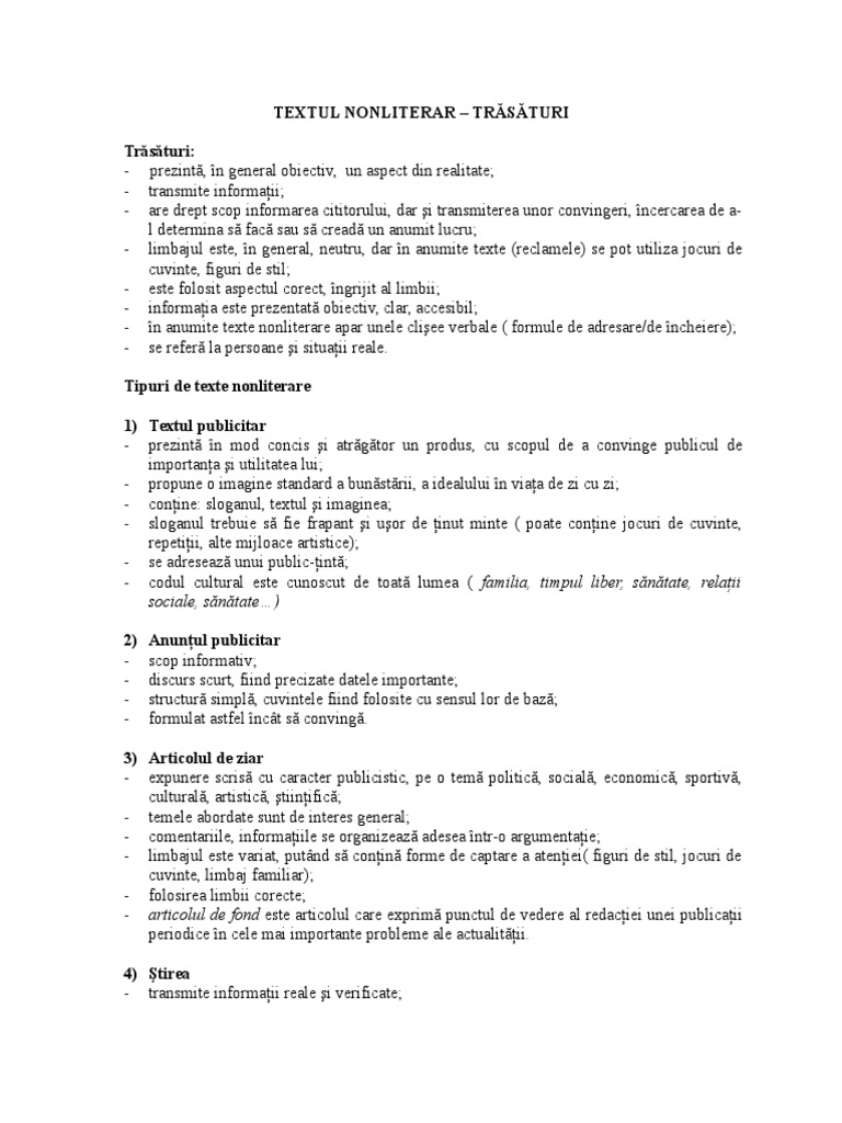 Un text nonliterar scurt despre un eveniment. Are un caracter nonficțional este bazat pe aspecte adevărate controlabile ale realității cotidiene. în limba lor înțelesul numelui acestei. Brainly plus te ajută să înveți mai repede oferindu ți ajutor nelimitat pas cu pas și explicații din partea experților. Textul nonliterar este rezultatul observării realității și al transformării acesteia în informații având scop informativ.