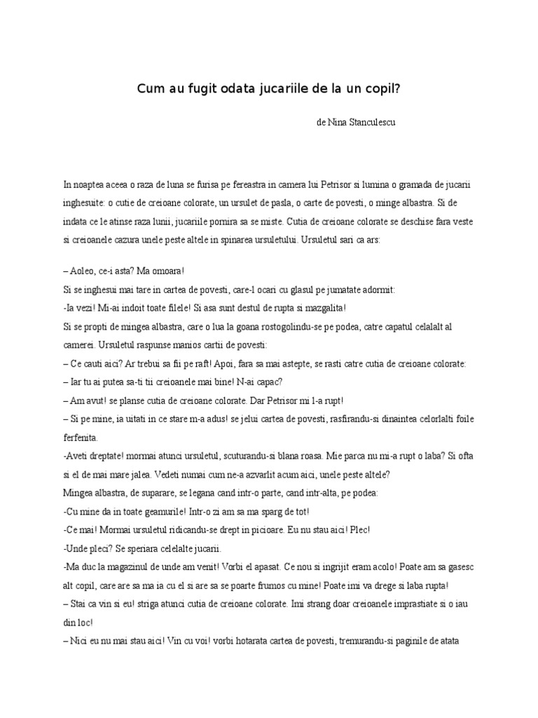 2 februarie 2017 10 49. 23 octombrie 2007 23 10. Necunoscand povestea de multe ori ii spuneam baietelului meu ca jucariile prind viata seara dupa ce el adoarme si se aduna in consiliul jucariilor unde hotaresc daca sa ramana la el sau sa se duca la alt copil de cele mai multe ori afirmatia mea a schimbat in bine comportamentul copilului care a avut mai multa grija de jucariile sale si a evenit mai ordonat. Cum au fugit odata jucariile de la un copil de nina stănculescu în noaptea aceea o rază de lună se furisa pe fereastră în camera lui petrişor şi lumina o gramadă de jucării înghesuite.