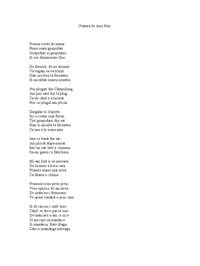 Un batran striga cea mai tare si nou uratura de anul nou la chilia lui daniil sihastrul. Potrivit tradiţiei colindătorii nu trebuie refuzaţi de gazde pentru că prin urările lor aceştia alungă spiritele rele. Colinde de craciun uraturi de anul nou pe site din data de. Ascultați că venim noi cu plugul mare tras de boi.