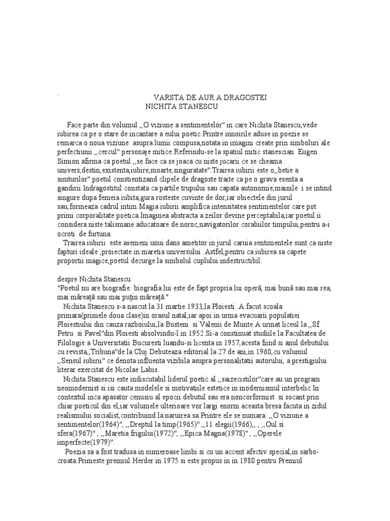 Varsta de aur a dragostei comentariu. Sub influența acestei teme se afla și volumul o viziune a sentimentelor apărut în 1964 din care face parte și poezia vârsta de aur a dragostei. Mainile mele sunt indragostite vai gura mea iubeste mainile si gura simtul tactil si simtul gustative devin simboluri in poezie. E un sentiment dulce acesta de trezire de visare şi iată mă fără să dorm aievia văd zeii de fildeş îi iau în mână şi. E un sentiment dulce acesta de trezire de visare.