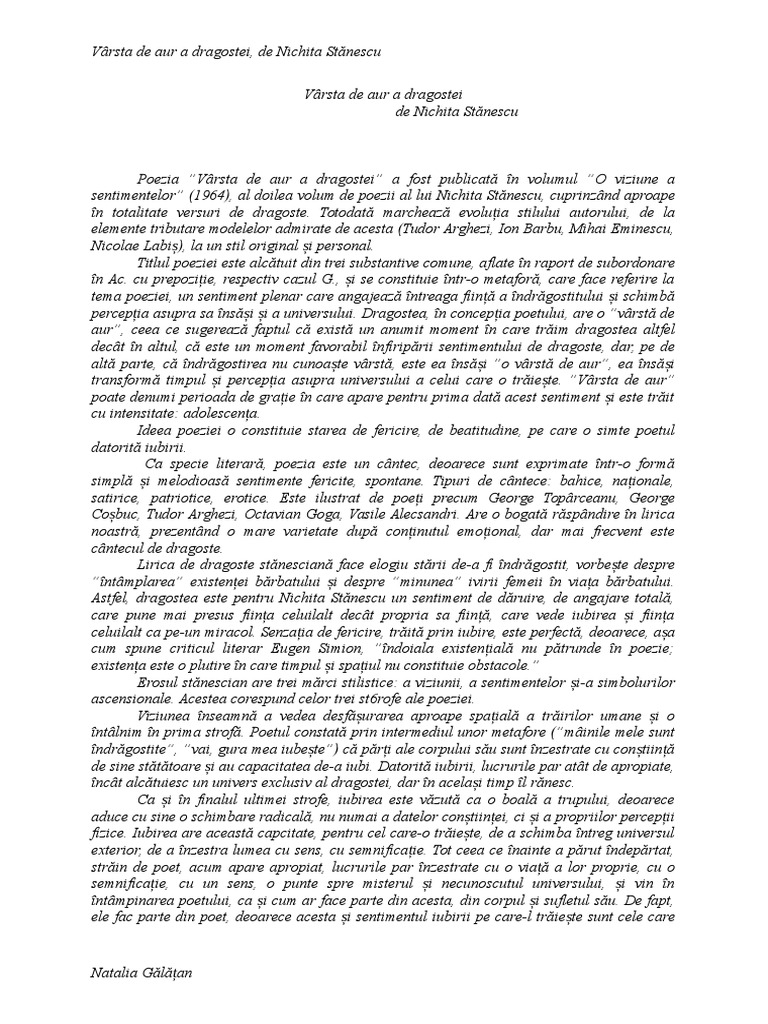 Varsta de aur a dragostei. In concordanta cu semnificatia titlului dragostea are o varsta de aur care poate sugera acea traire plenara totala a sentimentului dar ne determina sa facem asocierea cu cealalta semnificatie a sintagmei varsta de aur mitica care confera sentimentului caracter de unicitate de existenta atemporala si de repetitivitate prin asocierea cu elementul divin. Vârsta de aur a dragostei de nichita stănescu mâinile mele sunt îndrăgostite vai gura mea iubeşte şi iată m am trezit că lucrurile sunt atât de aproape de mine încât abia pot merge printre ele fără să mă rănesc. E un sentiment dulce acesta de trezire de visare şi iată mă fără să dorm aievia văd zeii de fildeş îi iau în mână şi. Vârsta de aur a dragostei este o poezie scrisă de nichita stănescu și inclusă în volumul o viziune a sentimentelor publicat în anul 1964.