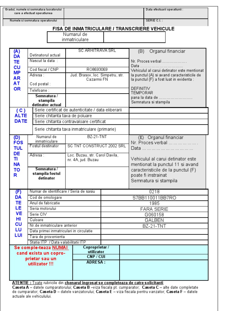 Vederea Inmatricularii Model Completare Cerere Inmatriculare Auto